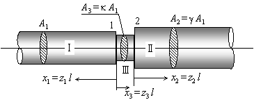 下図のようにヤング率E ,縦波の伝ぱ速度Cの無限長段付棒を伝ぱする応力波を考える.棒の各部T,U,Vの断面積はそれぞれA1 , gA1 , kA1とする.