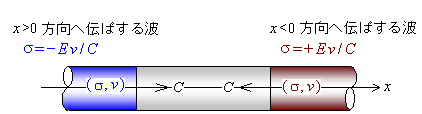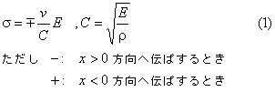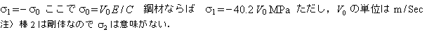∵ 速度を加えた左端は直ちに動くが,棒には慣性があるので,その他の部分は直ちには動けない.そのために左端には応力が発生伝ぱする.この応力波の値は次のようである.応力の伝ぱ方向と変位速度の向きは逆になるから,変位速度は
