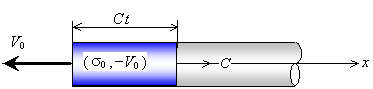 ,は速度で - V0 , 応力 s0 で動いており,その先は静止したままである.時間が経過するに連れて,この領域が広がり,やがて棒全体が動く.