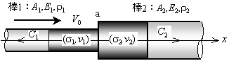 2本の棒1,2が相対速度V0で衝突すれば,両棒には,変位速度及び応力がそれぞれ(s1 , v1