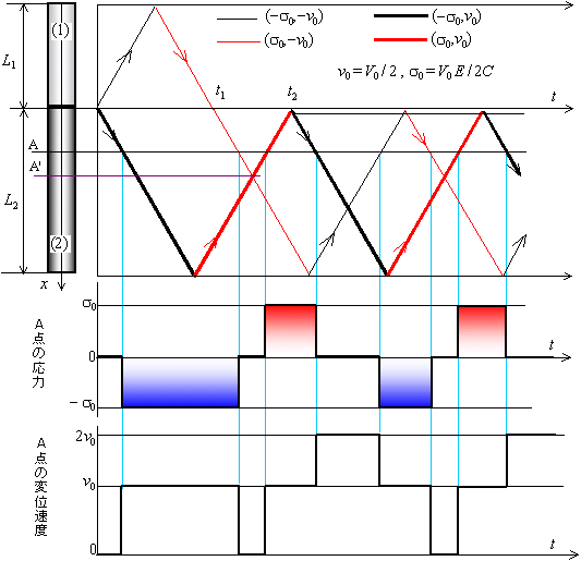 G棒の任意の位置,例えば,棒(2)A点の応力と変位速度は,これらの応力波がA点に到達する時間に,その値を順次加えて行けば求まる.上の例では